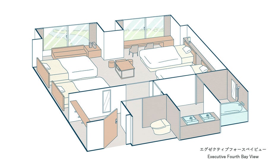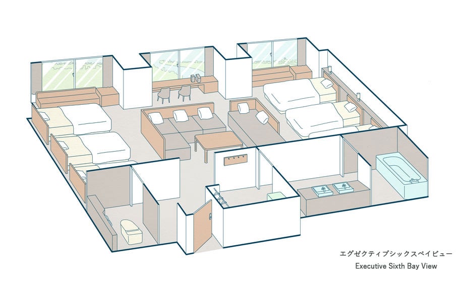 Executive rooms are equipped with ReFa beauty-brand shower heads, hair irons, shampoo, conditioner, and body wash. Our Executive Six Bay View room also features a 100-inch large-screen projector for enjoying your favorite videos and music. Take advantage of our superior accommodation plans to refresh your body and mind while enjoying a relaxing stay in a beauty-inspired environment courtesy of ReFa.
