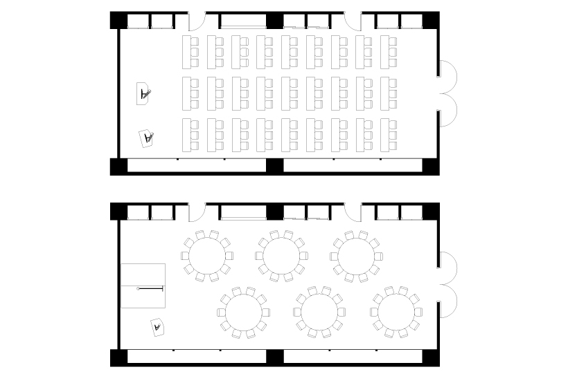 | 회의실・연회장명 | 장소(층) | 넓이(㎡) | 천장 높이(m) | 극장(명) | 강의실(명) | 리셉션(명) | 연회(명) | 口형(명) | U 자형(명) | |||||