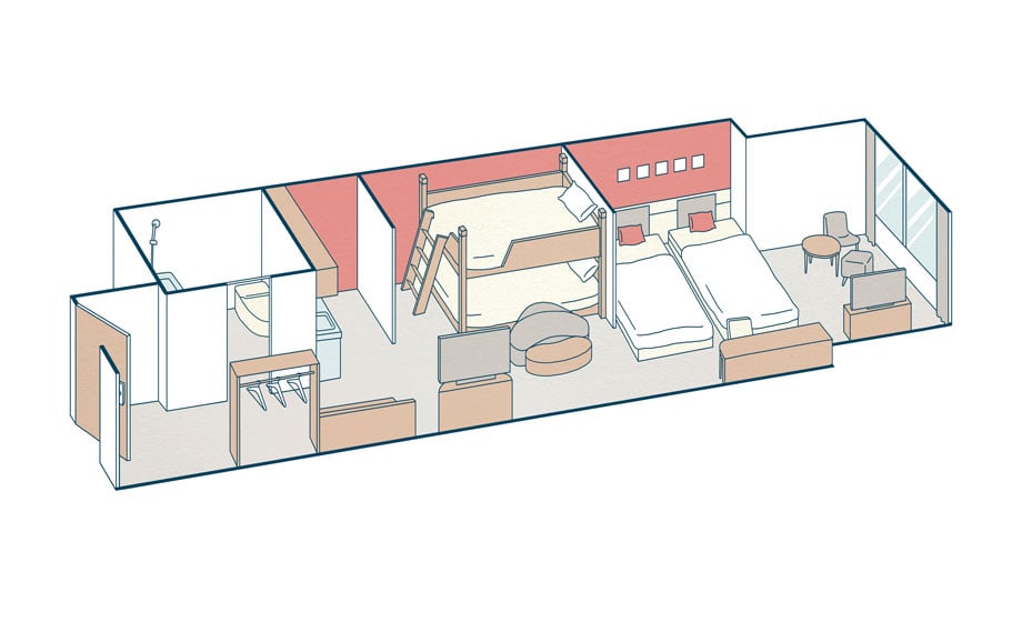 37m²의 실내에 폭 110㎝의 침대 2대와 2층 침대를 배치한 온 가족이 편안한 시간을 보낼 수 있는 객실입니다.