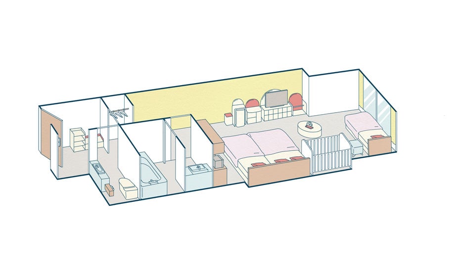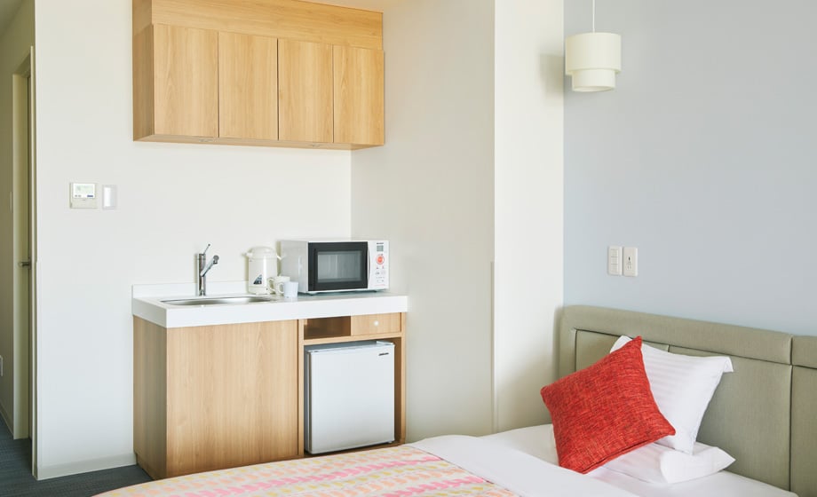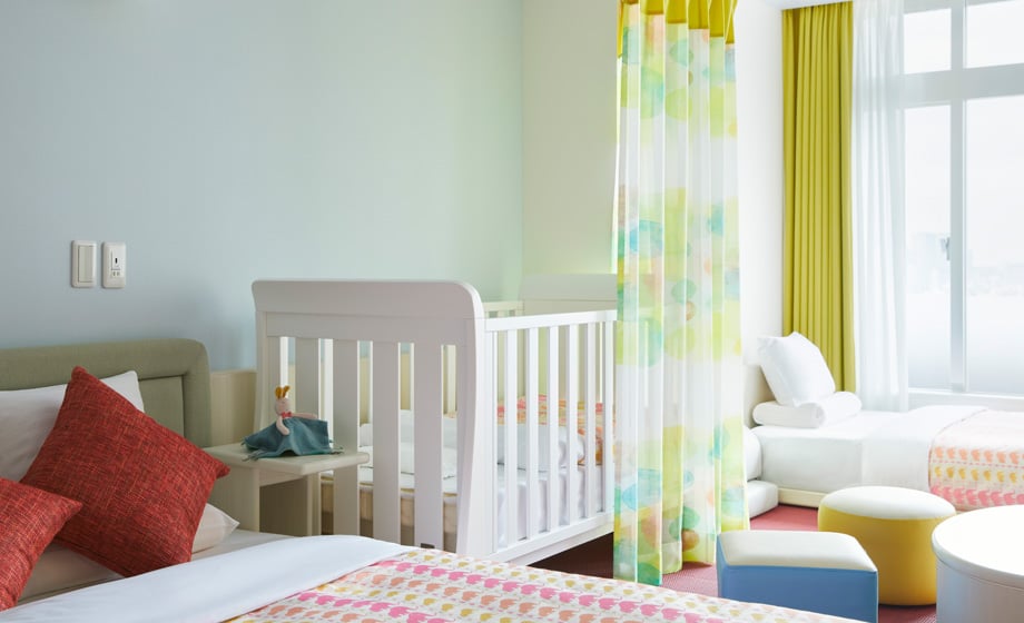 34m²의 실내에 폭 140㎝, 110㎝의 침대 및 유아용 침대 등 3대를 배치한 편안한 객실입니다. 이유식 및 분유를 준비하실 수 있는 미니 키친도 있어 엄마도 편리하게 이용하실 수 있습니다. 또한 모서리가 둥근 가구를 배치해 안심하고 지내실 수 있습니다. 엑스트라 침대를 이용하면 4명까지 숙박하실 수 있습니다.