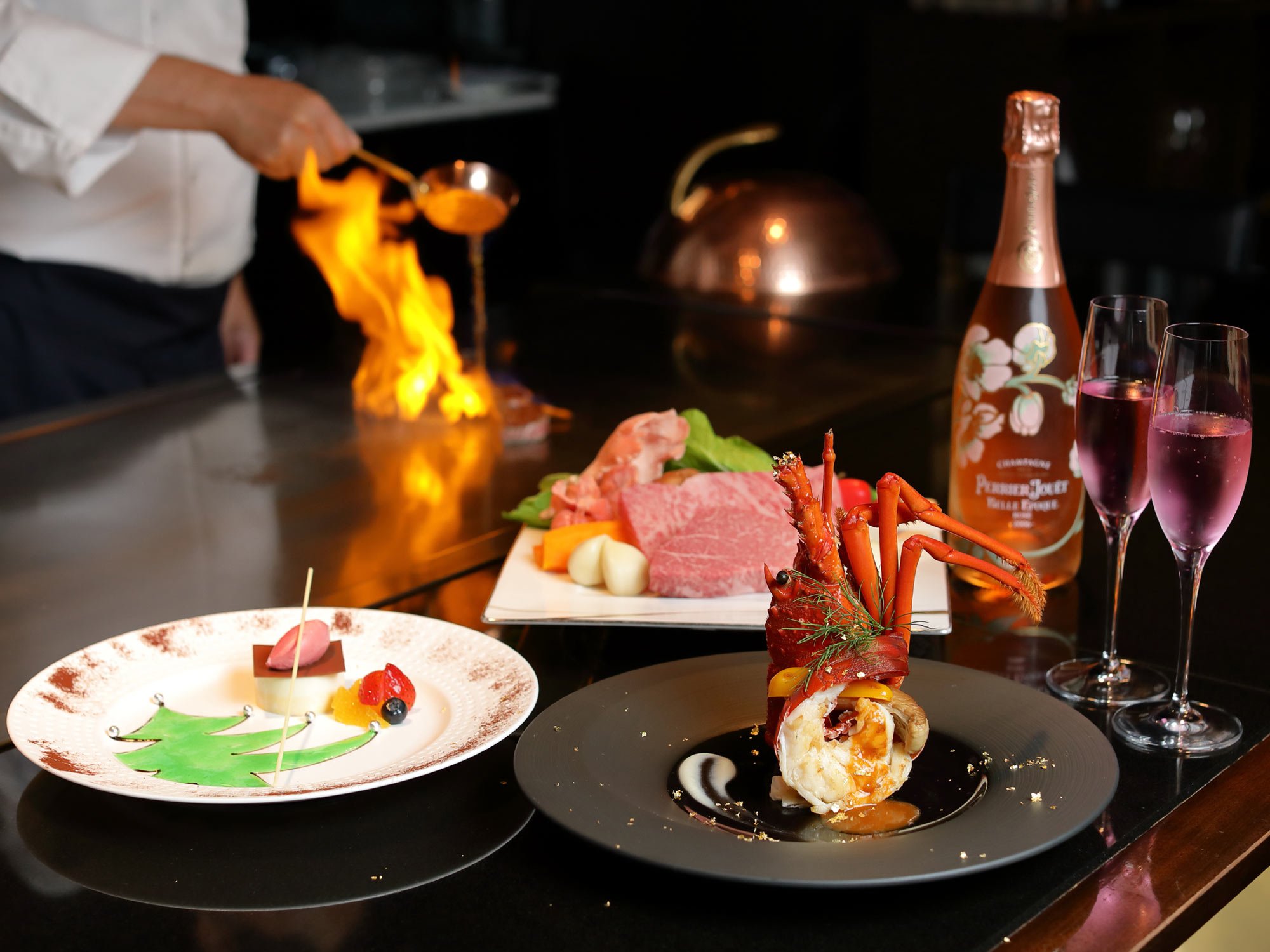 アミューズ・オードブル、スープ、フォアグラ、鮮魚のカルタファタ、伊勢海老の鉄板焼、黒毛和牛サーロイン60g、黒毛和牛フィレ40g、焼き野菜、ガーリックライス、赤出汁・香の物、デザート、コーヒー