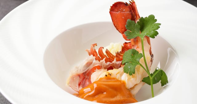 前菜、スープ、活カナダ産オマール海老、国産牛フィレステーキ100g、焼き野菜、白ご飯、赤出汁・香の物、デザート、コーヒー