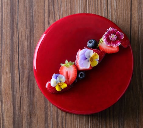 ストロベリームースとアプリコットのゼリーにキルシュを加え、大人のテイストに仕上げたケーキをカシスとラズベリーのジェルで鮮やかにコーティング、アーティスティックなケーキ。