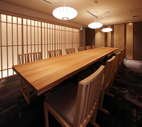 また、宴会や慶事、法事でのご利用を想定し、完全独立の「離れ」スタイルで個室もご用意いたしました。あえて畳スペースを一切使用しないモダン会席空間としてご利用いただけます。