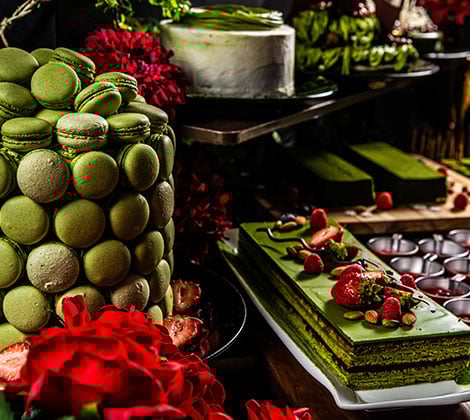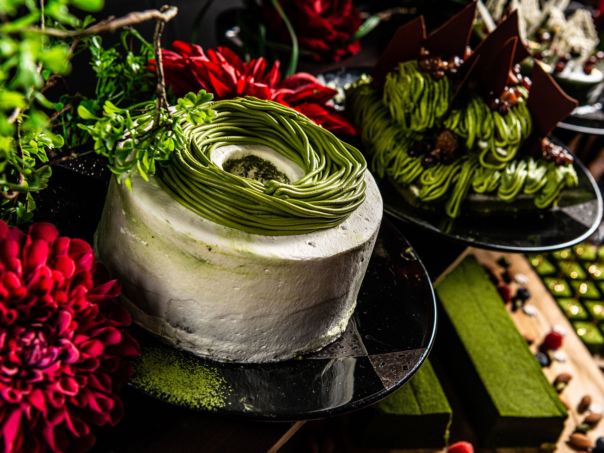 ビュッフェ料理のライブキッチンメニューは肉料理が登場します。「オーストラリア産ブラックアンガス牛ロースのステーキソースジャポネ」「ハンガリー産マグレカナールフィレ肉のソテー」はディナー限定、「神戸牛入りハンバーグステーキ」「鶏モモ肉のケイジャンゴボウチップ添え」はランチ限定、ランチ・ディナー共通メニューには「スペイン産イベリコ豚のグリルバジルソース」がそれぞれ登場です。さらに、料理にも抹茶を使ったメニュー「焼き立てピッツァサルモーネ抹茶仕立て」「出来立てパスタ抹茶クリームソース」をお楽しみいただけます。