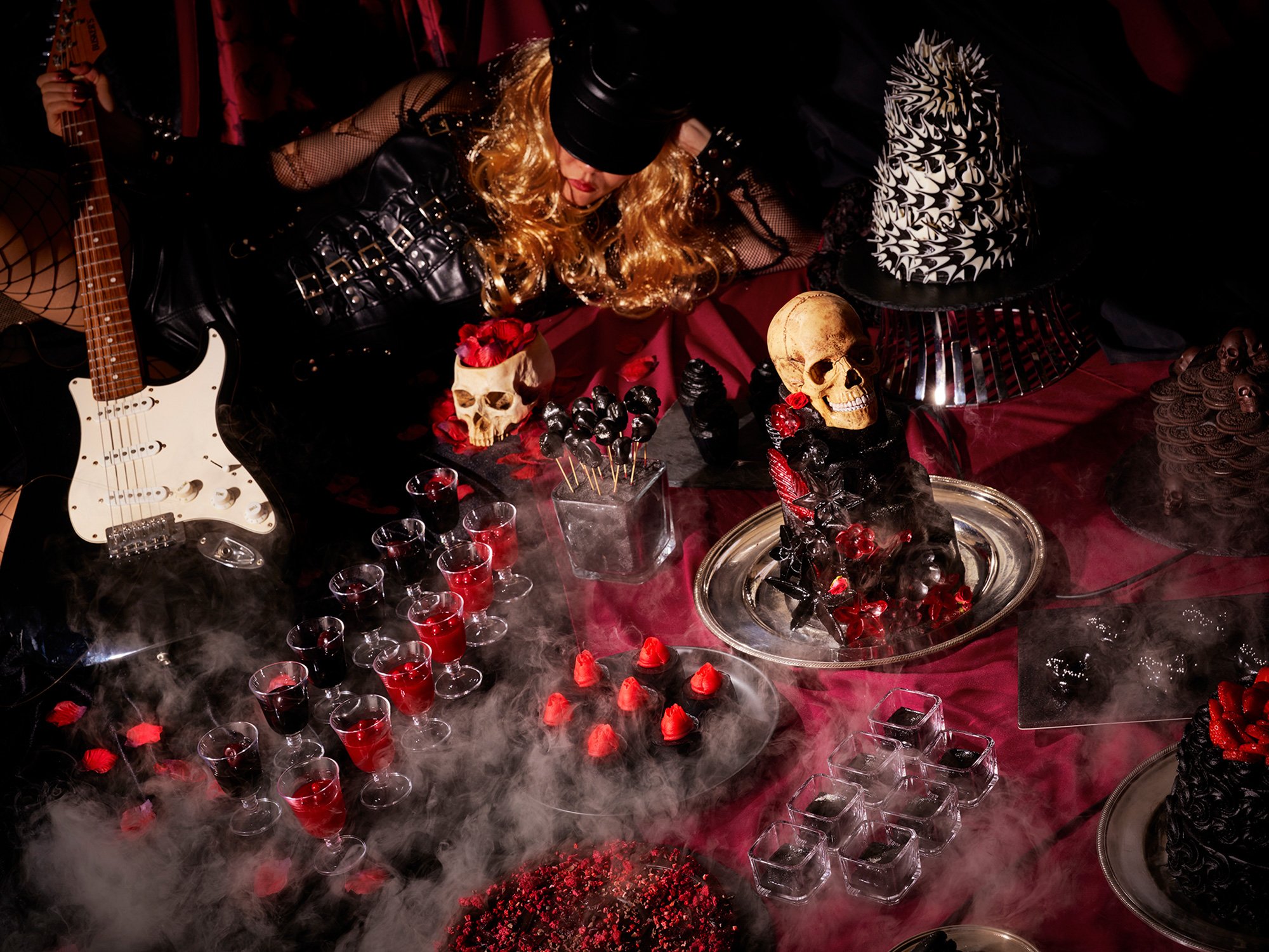 低音を全面に押し出し、速いビートと金属的なギター奏法、叫ぶようなボーカルの特徴をもつ激しいロックである「ヘヴィメタル」をテーマに、ブラックとシルバーを基調としたスイーツをご用意しました。80年代のヘヴィメタルファッションとアートなスイーツが融合した懐かしくもあり、過激でカワイイ刺激に満ちたロックな空間を演出します。