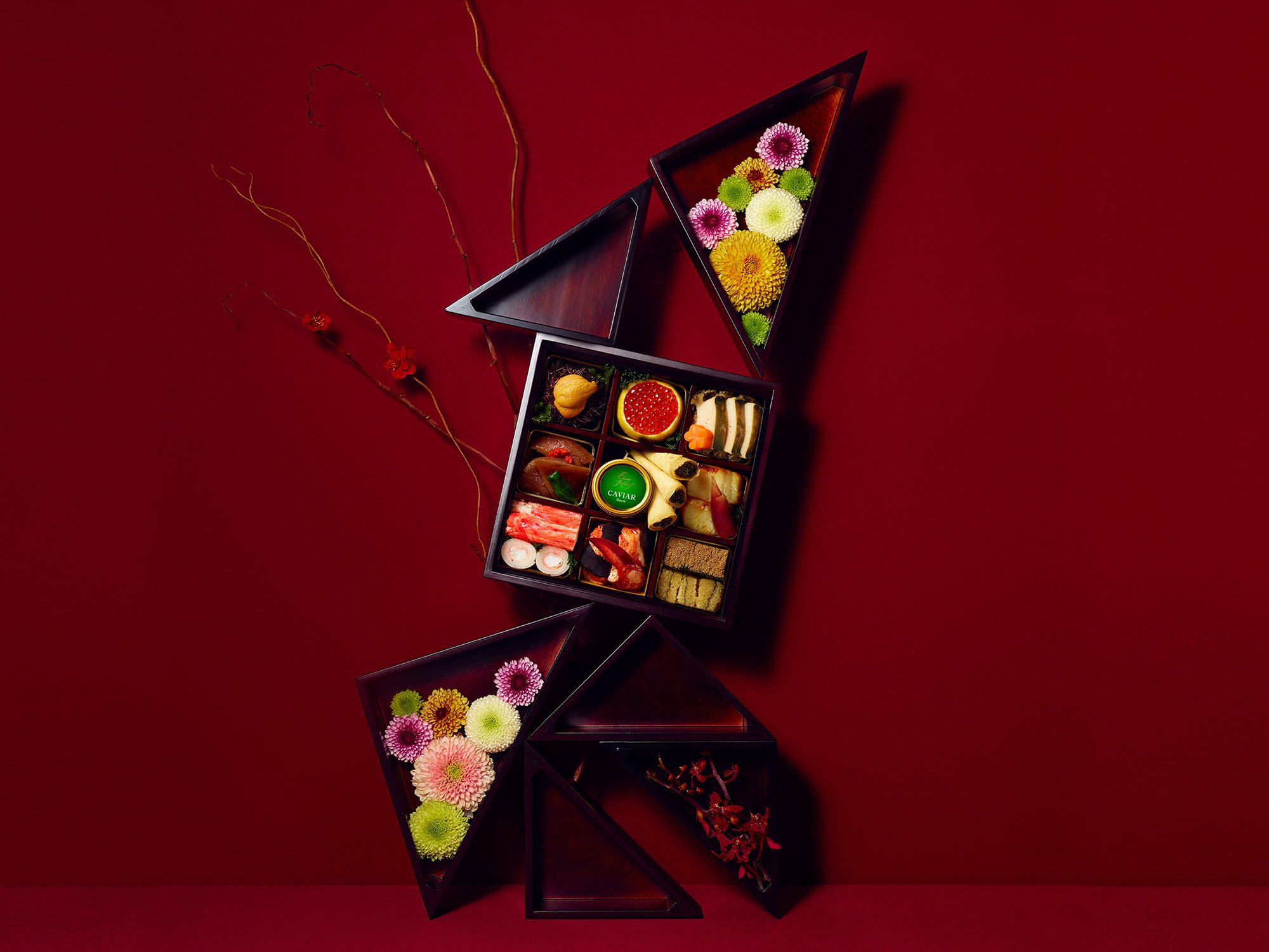 超特選究極おせち「閻浮提 -Enbudai-」は、アートホテル大阪ベイタワーの全精力を結集した、贅沢を極めた芸術(アート)おせち。高級食材をふんだんに使い、味はもちろん、見た目にもこだわって仕上げました。お重は、珍しい三角形をした一つひとつ手彫りの木製箱を使用、贅を極めた究極のおせちです。