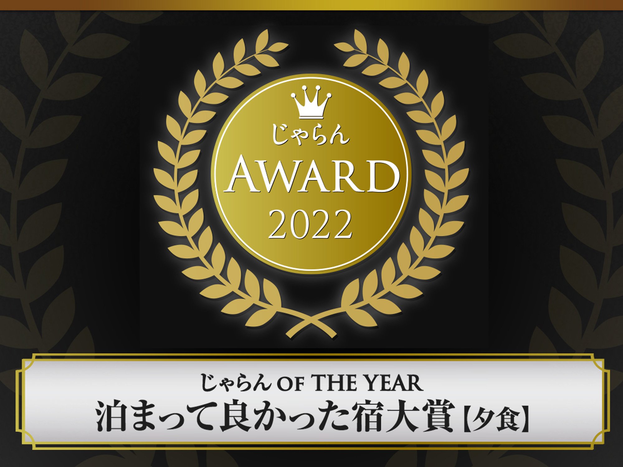 じゃらんアワードとは 「じゃらん」は、その年度に顕著な実績を収めた宿泊施設や地域を表彰する目的で2012年に「じゃらんアワード」の表彰・発表を開始。「じゃらんアワード2022」で10回目の表彰・発表となる。「じゃらん」は、サービス開始当時より、宿泊施設・地域の魅力を発掘・発信してきたが、宿泊施設の優れた取り組みを共有し表彰することで、多くの方に宿泊施設の魅力を伝え、旅行業界の進化・発展に寄与したいとの思いで「じゃらんアワード」を開催している。 じゃらん OF THE YEAR 泊まって良かった宿大賞(夕食部門)の審査基準は、「じゃらんnet」のクチコミ評点(夕食)が上位の宿泊施設に贈られる。