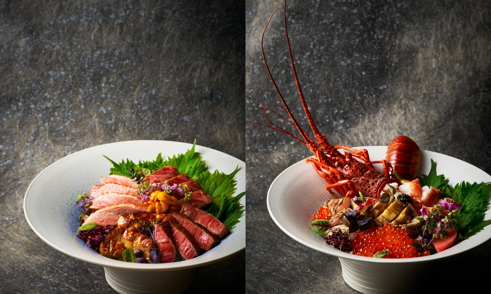 上質で柔らかい旨味と肉質が豊潤な神戸牛や黒毛和牛、河内鴨等旨味を引き立てた丼「贅沢の極み丼 ~黒極 KOKUGYOKU~」、と旨味抜群の活イセエビ、活鮑、ノドグロ等、海の高級食材をふんだんに使用した海鮮丼「究極の海選丼 ~紅極 KOUGYOKU~」の2種類をご用意。
