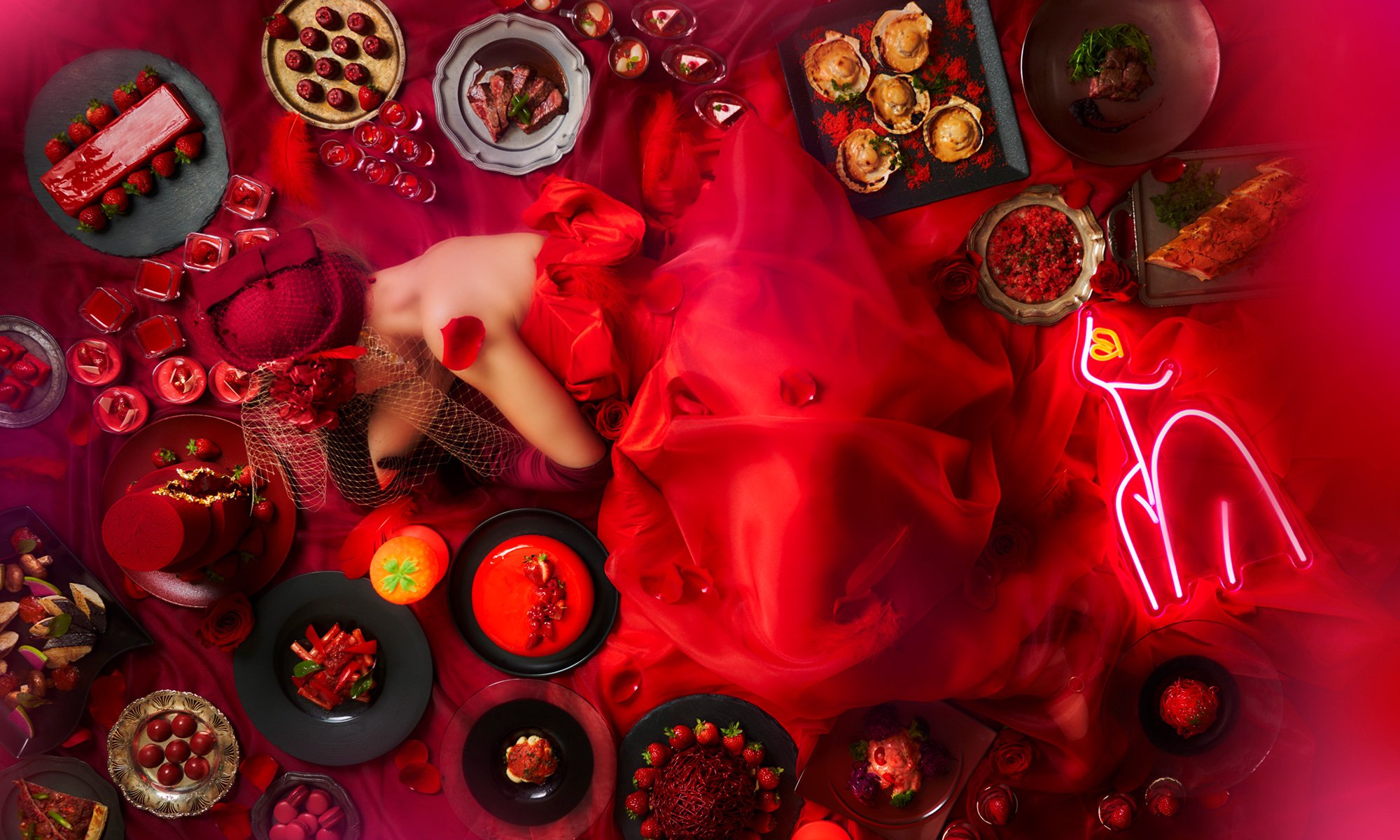 当ホテルでは毎年、いちごが旬を迎える1月から5月にかけて、いちごスイーツビュッフェを開催しております。味も見た目も異なるさまざまないちごスイーツをお客様にお楽しみいただきたい思いのもと、2024年はテーマを2回に分けてお届けいたします。1月・2月はパステルカラーを基調としたキュートないちごスイーツをお楽しみいただきました。3月からはコンセプトを一新。近年推し色として人気の高い「赤」を基調とし、情熱的で妖艶な大人の世界をテーマに企画いたしました。