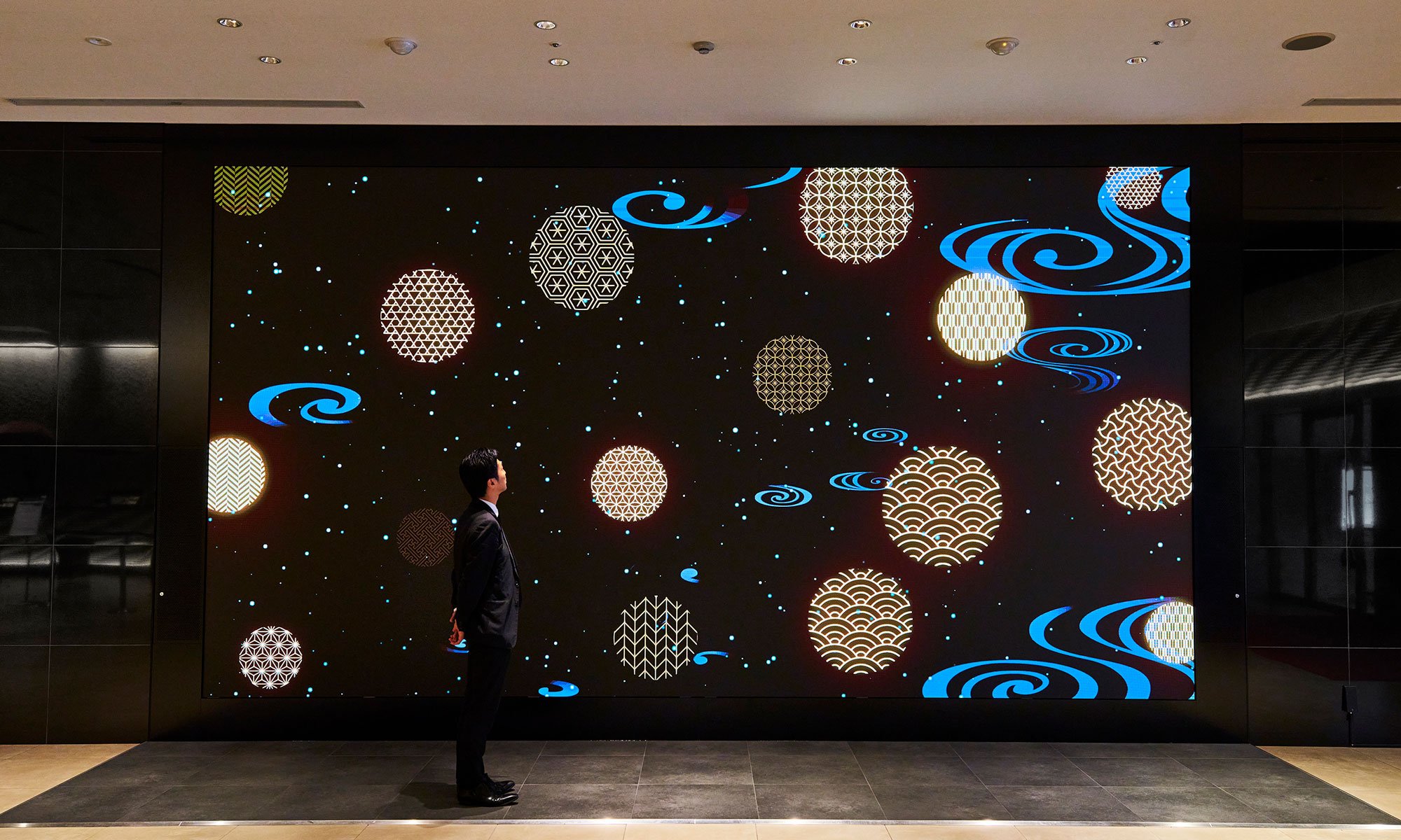 映像は、チェックインの待ち時間やロビーでのひとときを単なる待機時間を超えて特別な体験として感じていただけるよう、3つの構成から成り立っています。最新の画像生成AIやCG技術を駆使し、空庭温泉で楽しめる非日常的な魅力を存分に伝える紹介映像、変化し続けるロビーの雰囲気や四季の変化に呼応するかのように24時間365日変化し続ける、伝統的な和柄モチーフを用いたベース映像、そして華やかな色彩で空間を彩るアクセント映像。