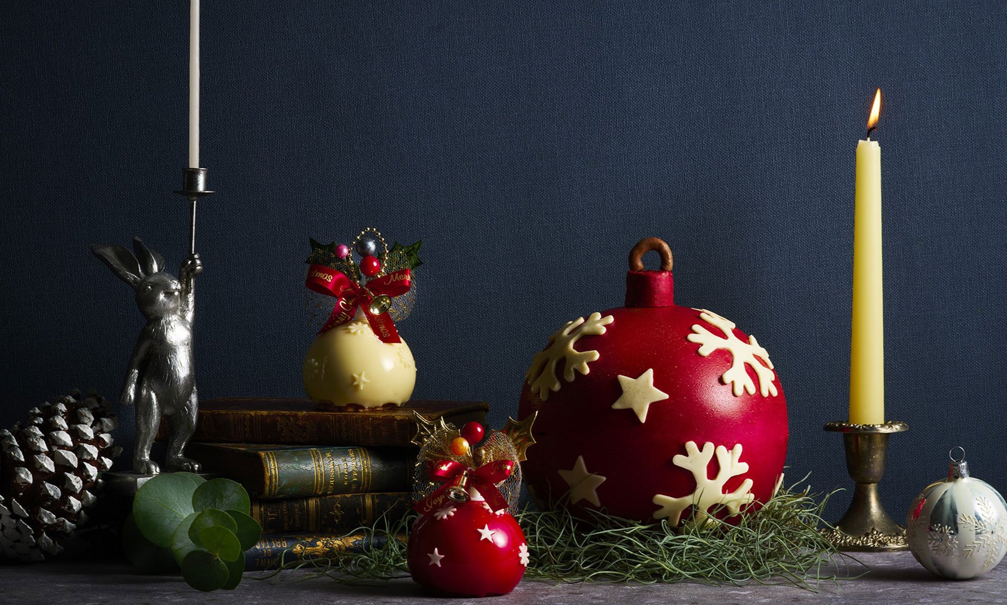 クリスマスツリーに飾るオーナメントを再現したケーキ。オーナメント部分はチョコレートでできており、開けると、甘酸っぱい苺がたっぷり約20個と濃厚なピスタチオのムースケーキが詰まった背徳感溢れる絶妙なハーモニーが味わえます。