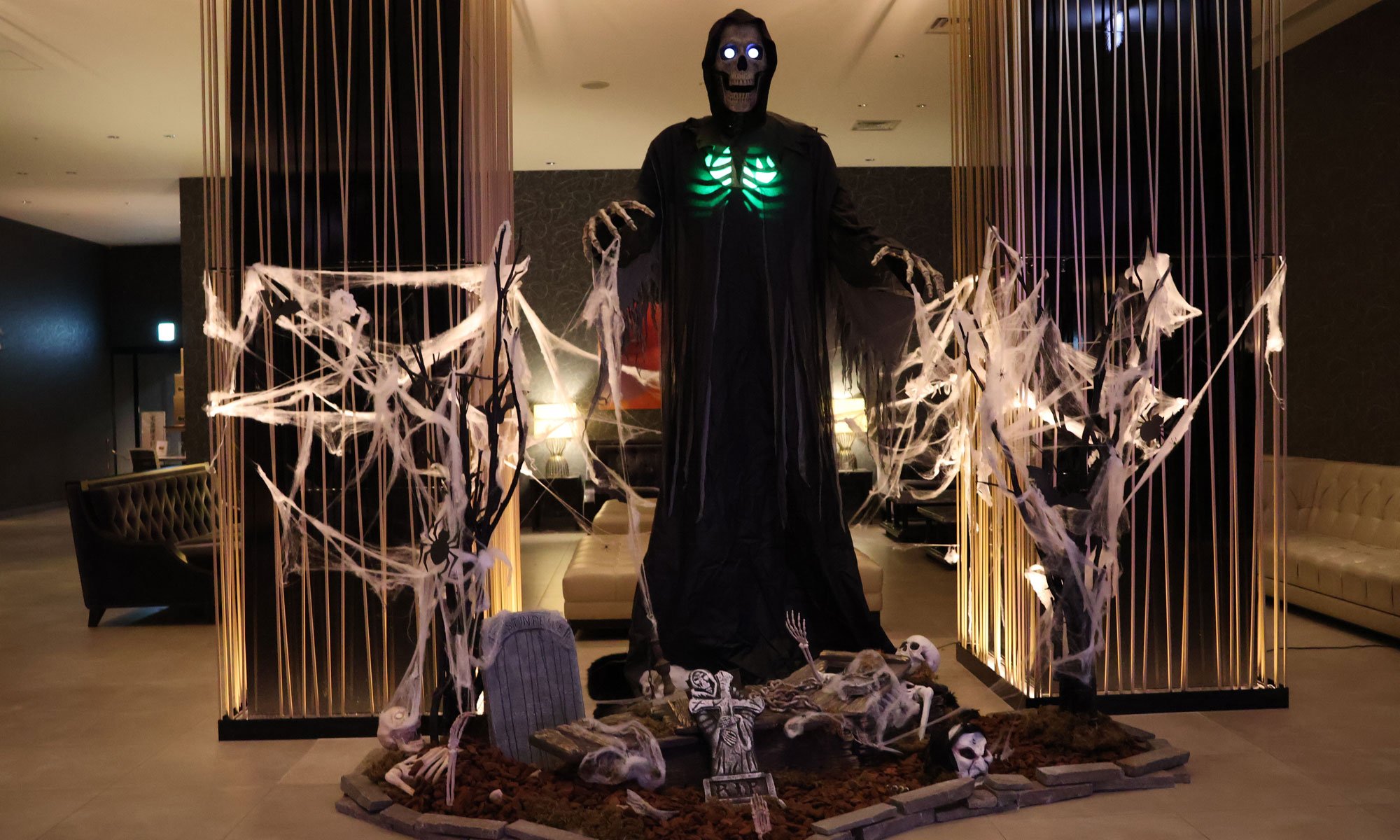 正面にて待ち受ける恐怖を感じるとともに魅惑に引き込まれる3mの巨大スケルトンは想像を超える迫力。また、ロビー各所に光と闇の狭間で静かに空中を彷徨う亡霊も出現。「インスタグラム フォトコンテスト」や「トリックオアトリート」キャンペーンも期間限定で実施いたしますので、この機会に是非、アートホテル大阪ベイタワーが表現する恐怖と魅惑の一夜へお越しくださいませ。