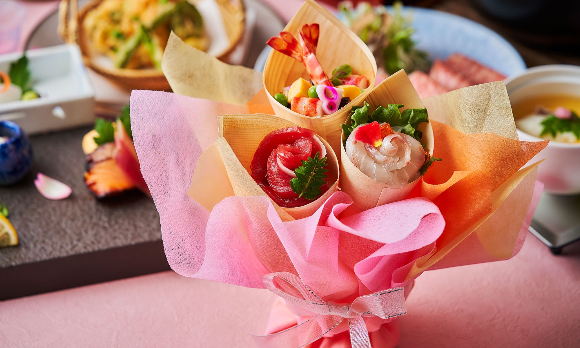 アートホテル大阪ベイタワー20階 割烹みなとでは2024年11月1日(金)より、特別な日を彩る「ブーケ寿司」付きの記念日会席コースを販売いたします。