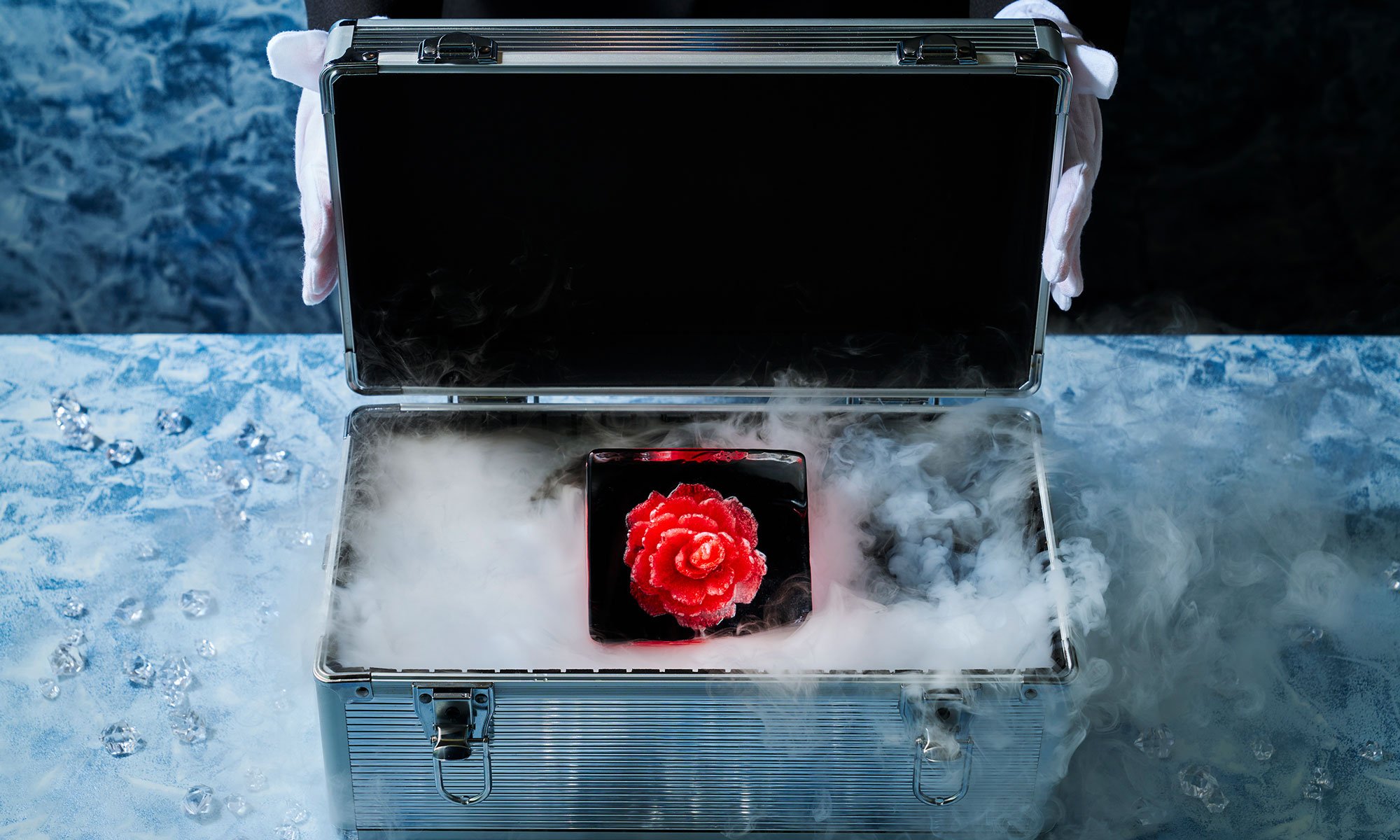 特典2:「え、何これ!?」謎めいたジュラルミンケースから始まる、味わう前のサプライズ かき氷をお作りする前に、まずはお客様に細工氷をお披露目させていただきます。細工氷はジュラルミンケースに収められ、白手袋を着用したスタッフがテーブルまでお届けします。蓋が開けられるとドライアイスのスモークの中から、花の彫刻が施された美しい細工氷が姿を現します。削る前のほんのひととき、儚くも鮮やかな“夏の涼”をお楽しみください。