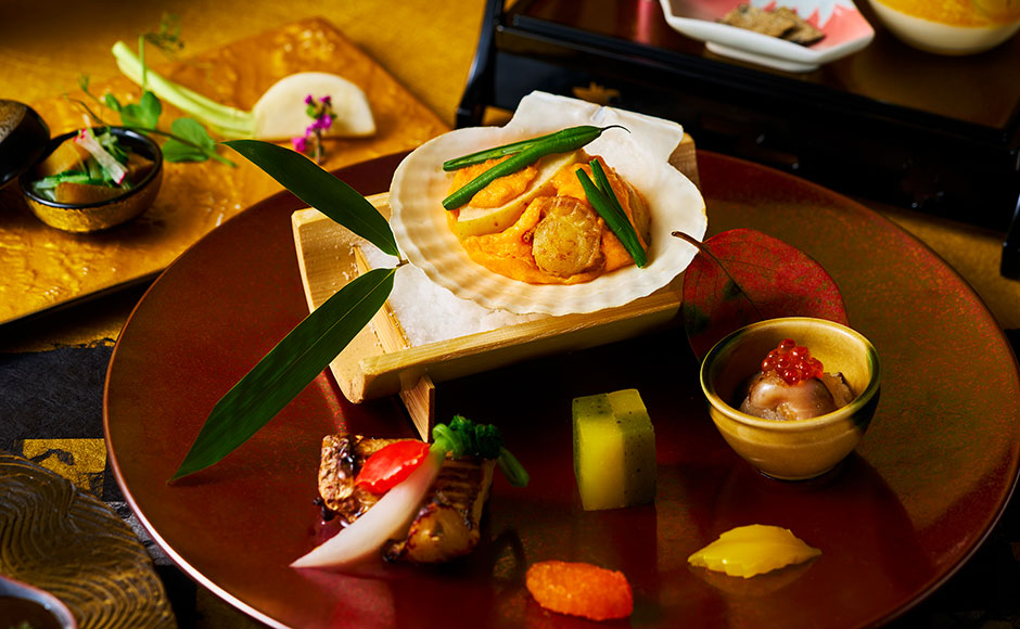 新料理長が手掛ける本会席では、伝統的な日本料理の技と大阪の食文化、そして洋のエッセンスをさりげなく織り交ぜ、冬ならではの味わいを一皿ごとに丁寧に表現しました。また、旬の食材が持つ彩りや質感を活かした盛り付けにもこだわり、味わいとともに季節の移ろいを感じていただけます。