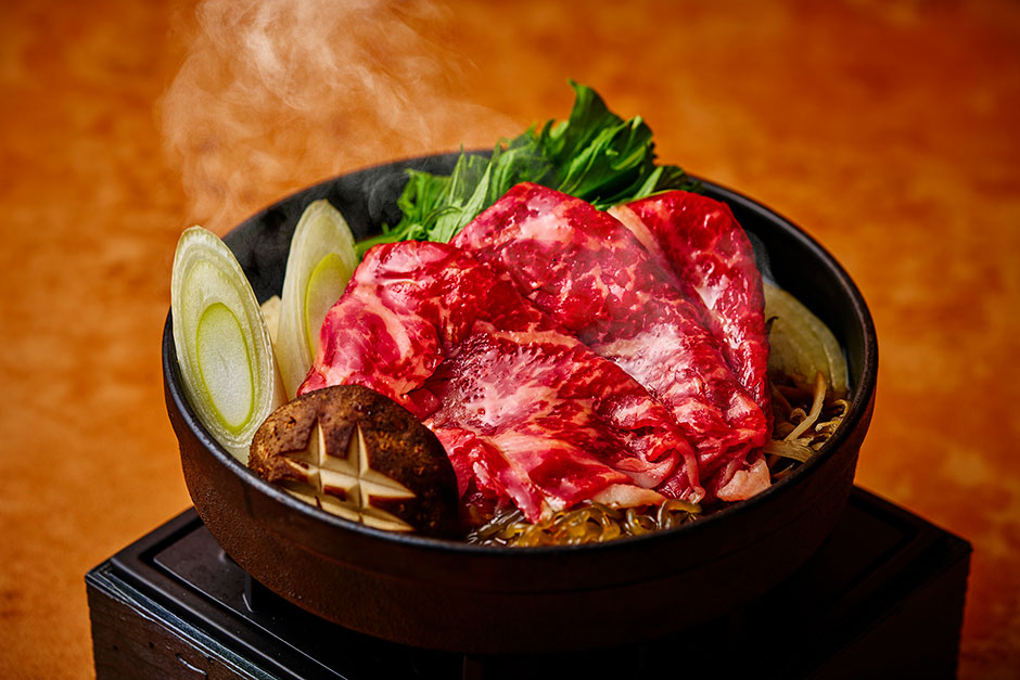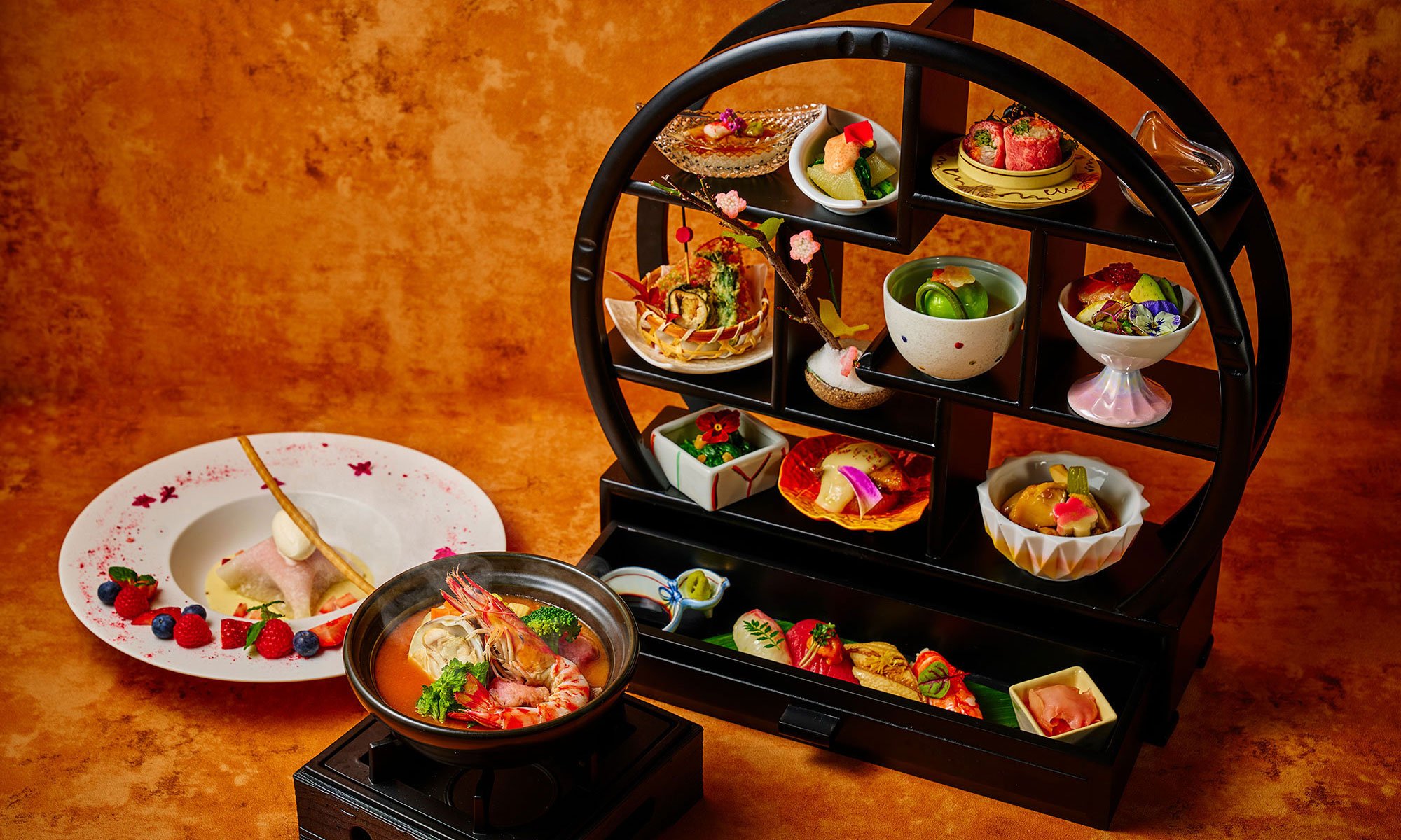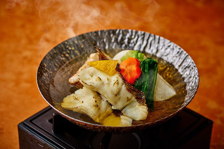 和の趣で存在感あるティースタンドに盛り付けた前菜や小鉢は、肉・魚・野菜をバランスよく取り入れ、鶯が告げる早春の訪れを一品一品に映し出しました。まるでアフタヌーンティーのように少しずつ多彩な味わいが楽しめ、心華やぐ上質なひとときを演出します。続く小鍋は、一人ひとりが自分のペースで気兼ねなく楽しめるように仕立てた3種から選べる『ごほうび鍋』。温かな湯気に心までほぐれるような時間をお過ごしいただけます。