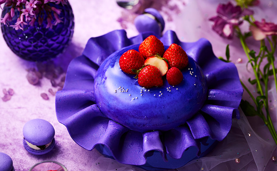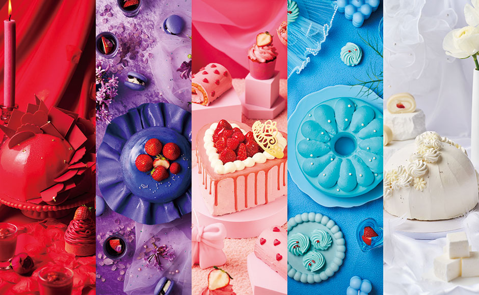 本企画のスイーツは、レッド・パープル・ピンク・ブルー・ホワイトの5つの色にそれぞれに異なる“ペルソナ”を設定し、その性格イメージをもとに見た目の印象だけでなく、味わいからも色ごとの個性や感情が伝わるよう考案しました。各色3種類(ホールケーキ1種+プティスイーツ2種)、計15種類のいちごスイーツでラインアップ。スイーツの名前にもこだわり、各ペルソナが放つ“決めセリフ”をイメージしたネーミングです。