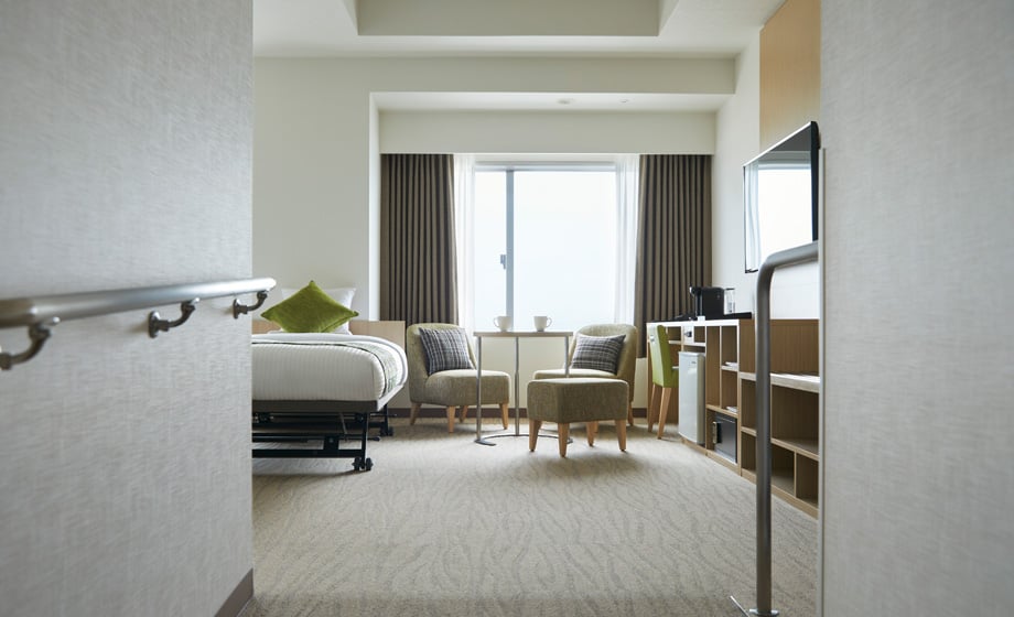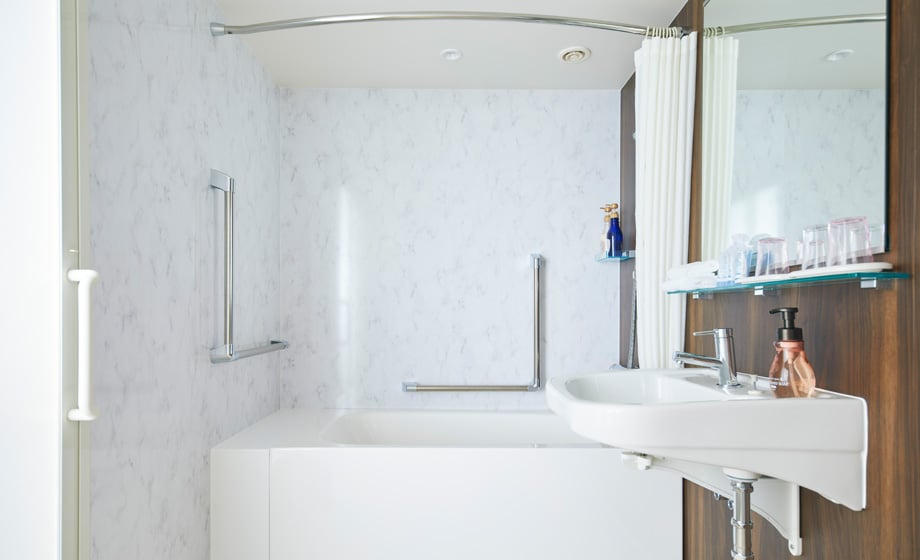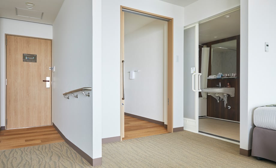 43m²の広々とした室内に幅120cmのベッドを2つ配したお部屋です。 バス、トイレもバリアフリーに対応し、安心してご利用いただけます。 車いすにも対応した広々としたサイズで様々な方に、 快適にお過ごしいただけます。 エキストラベッドのご利用で3名までお泊りいただけます。