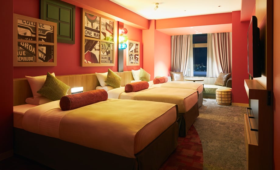 34~36㎡の室内に幅120cmのベッドを2つ配した、 テーマパークのような遊び心満載のお部屋です。 ホテルでもワクワクした楽しさをそのままに過ごしていただけます。 エキストラベッドのご利用で3名までお泊りいただけます。
