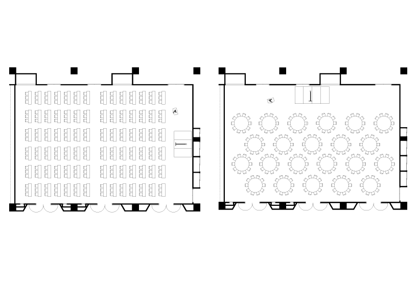 若餐點為正式套餐,可容納500人,桌椅配置的教室形式可容納600人,只有排列椅子的劇院形式則可容納1,300人,