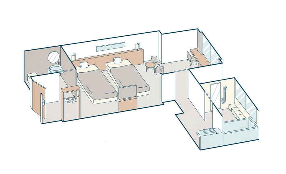 客房以「Urban Natural & Casual(都市自然 & 休閒)」為理念,以自然的素材和彩繪營造了溫暖舒適感,浴室採用了全景設計,可以欣賞大阪的美景,還配備了北歐瑞典的三溫暖品牌「Tylö(帝夢)」的蒸汽三溫暖。溫暖細密的蒸汽將全身包裹,有美肌、調養身心的功效,讓您的精神更飽滿,身體更健康。歡迎您一邊眺望大阪街市或大阪港灣的風光,一邊享受至高無上的泡浴時光。
